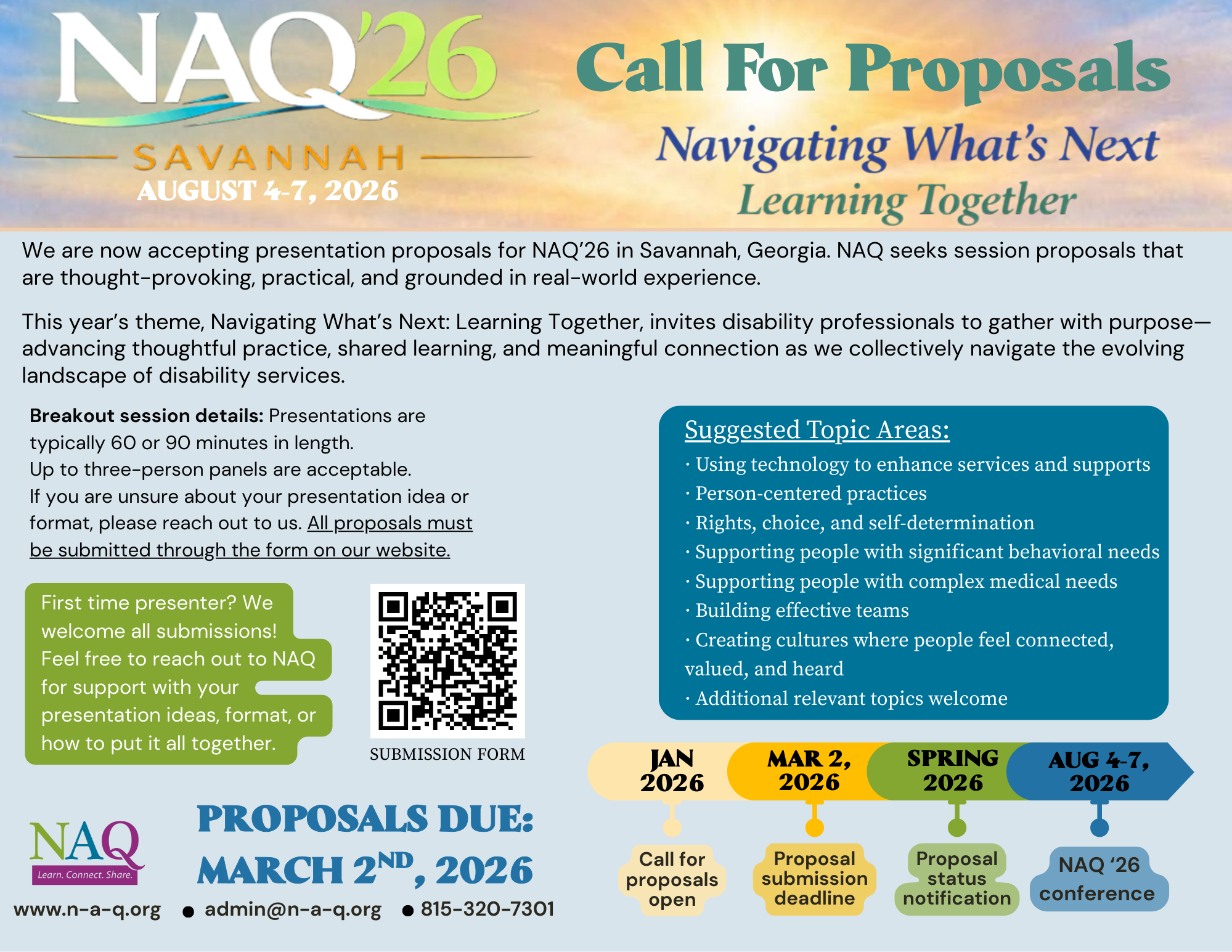 Call for ProposalsNavigating What's Next: Learning TogetherThe IDD field is experiencing ongoing change as rules and regulations evolve, workforce challenges continue, and service expectations increase, often in a climate of diminishing resources. The NAQ’26 Conference invites presentation proposals that reflect the realities of today’s service provider environment while sharing practical strategies, innovative practices, and thoughtful perspectives to help move the field forward.